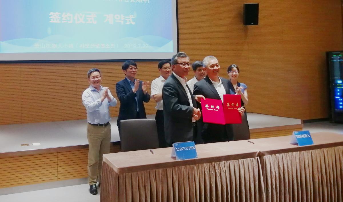【國辰訊】2019722日,杭州國辰機器人科技有限公司與韓國(株)亞進EXTEK合作成立合資公司簽約儀式在蕭山機器人小鎮隆重舉行。蕭山經濟技術開發區黨工委委員、管委會副主任徐建中,開發區招商局副局長、機器人小鎮工作組負責人陳笑,浙江省機器人產業發展協會秘書長王國耀,韓國大慶機器人振興社會長金昌浩,杭州國辰機器人科技有限公司首席戰略官王國成、韓國(株)亞進EXTEK常務崔成赫等出席簽約儀式。